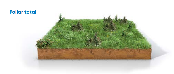 La aplicación foliar total de herbicidas, como su nombre lo indica, tiene la cobertura total del área, afectando a todas las plantas presentes en el pasto. Es la modalidad con el mayor ingreso operativo y, por lo tanto, la más deseable tanto por el ganadero como por las empresas que suministran insumos y proveedores de servicios.