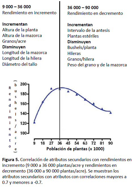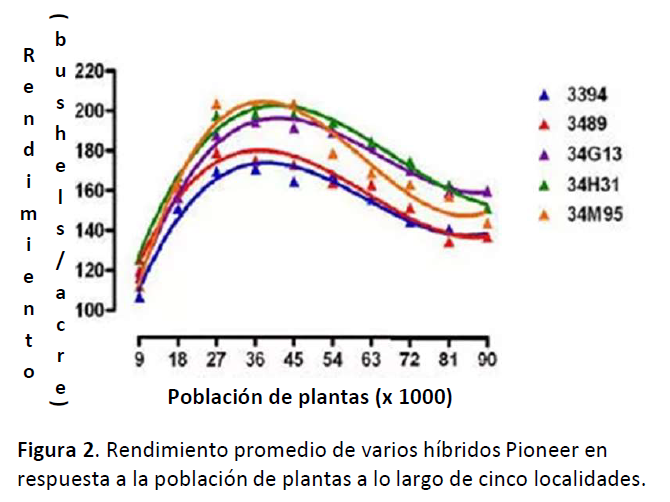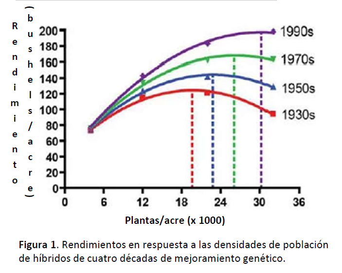 El progreso que los investigadores han hecho en mejorar la tolerancia al estrés se demuestra en un estudio que compara la respuesta de híbridos modernos con híbridos más viejos a la población de plantas. En este estudio, se sembraron híbridos Pioneer desde 1930 hasta 1990 para alcanzar poblaciones de 4000, 12 000, 22 000 y 32 000 plantas/acre. En bajas densidades (un ambiente de estrés bajo) no se presentaron diferencias en rendimiento en híbridos de las diferentes décadas (Figura 1). Sin embargo, la población óptima para maximizar el rendimiento fue más alta con híbridos de cada subsecuente era. Los híbridos más nuevos se adaptaron mucho mejor a los niveles más altos de estrés en poblacionesmás altas y produjeron los rendimientos más altos.